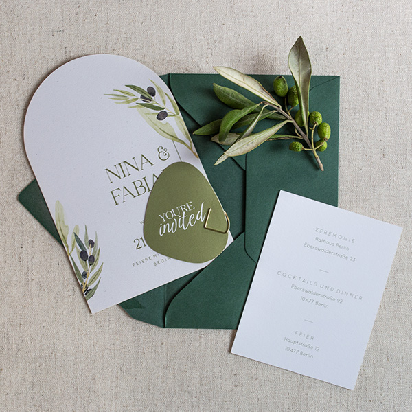Einladungskarte in gebogener Form und mit Olivenzweigen. Dieses Design ist perfekt für Paare, die nach einer mediterranen und sommerlichen Einladung suchen.