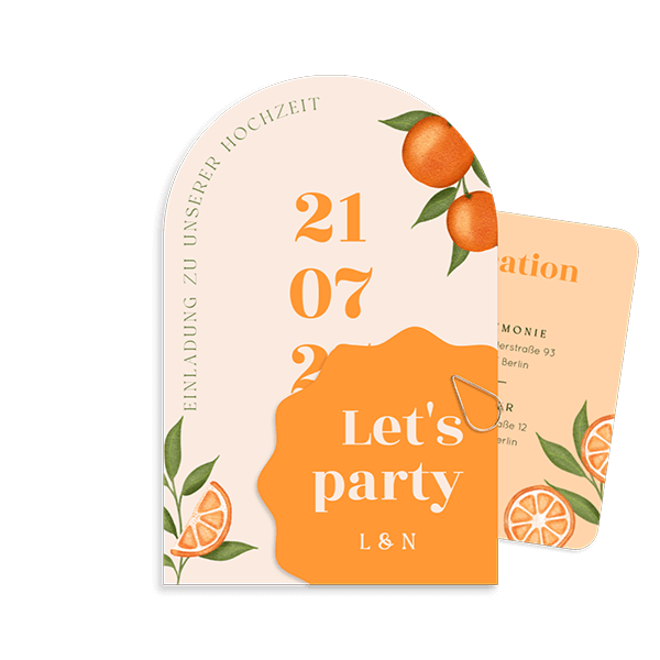 Kartenset in Orangetönen mit Orangenzweigen in gebogener Form. Dieses moderne Design ist perfekt für Paare, die nach einer modernen und einzigartigen Einladung suchen.