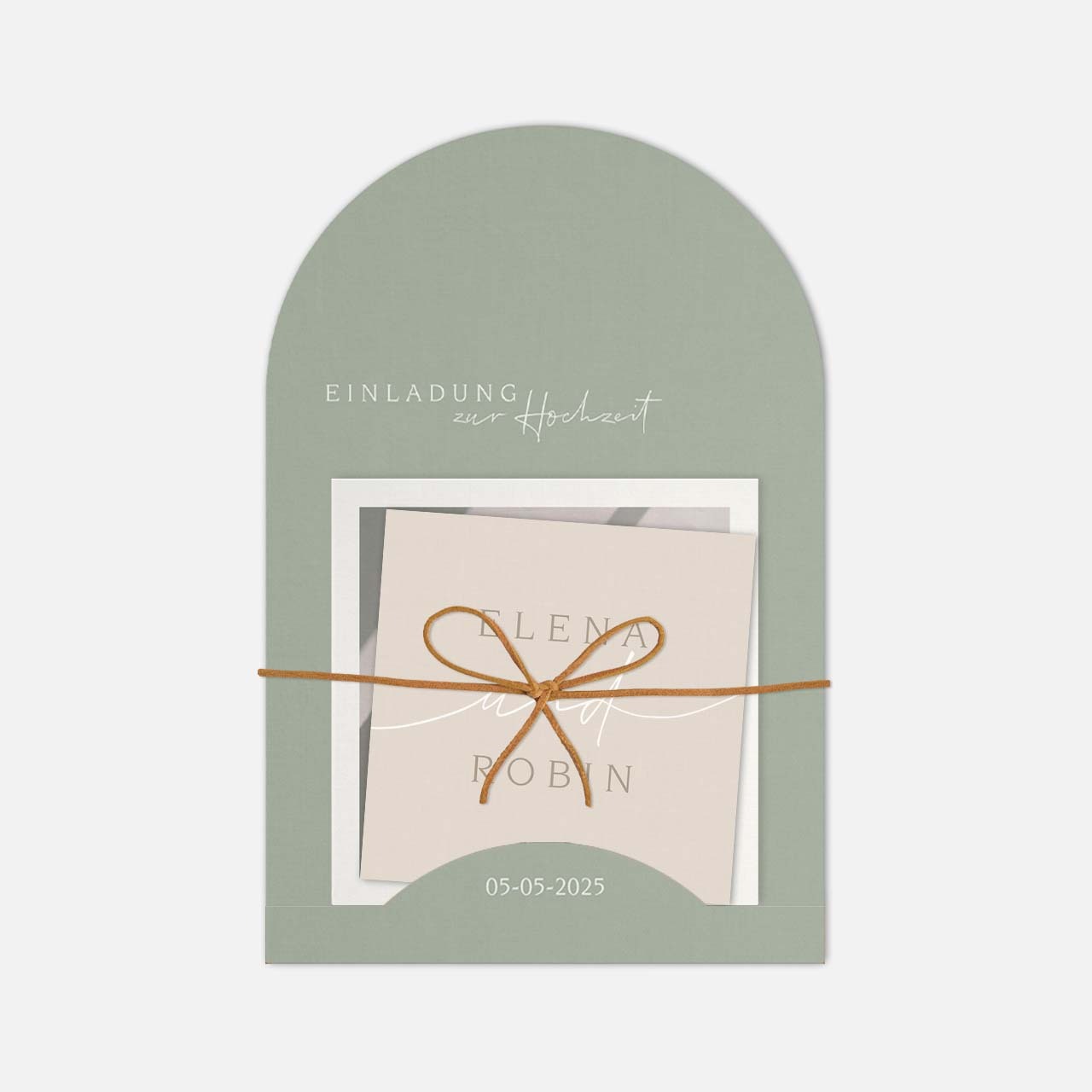 Moderne Hochzeitseinladung-Set in Halbbogenform mit Foto und Schnur. Dieses Design ist perfekt für Paare, die nach einer stilvollen und ausgefallenen Einladung suchen.
