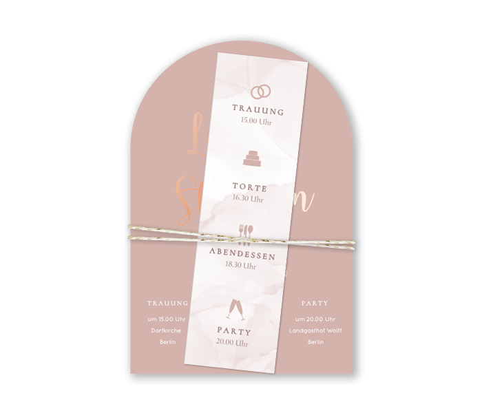 Hochzeitseinladung in Bogenform mit extra Tagesablauf und Roségoldfolie. Dieses Design ist perfekt für Paare, die nach einer stilvollen und schlichten Einladung suchen.