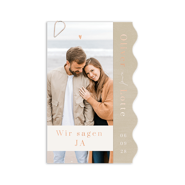 Originelle Hochzeitseinladung in Beigetönen mit Wellenrand. Dieses Design ist perfekt für Paare, die nach einer modernen und stilvollen Einladung suchen.