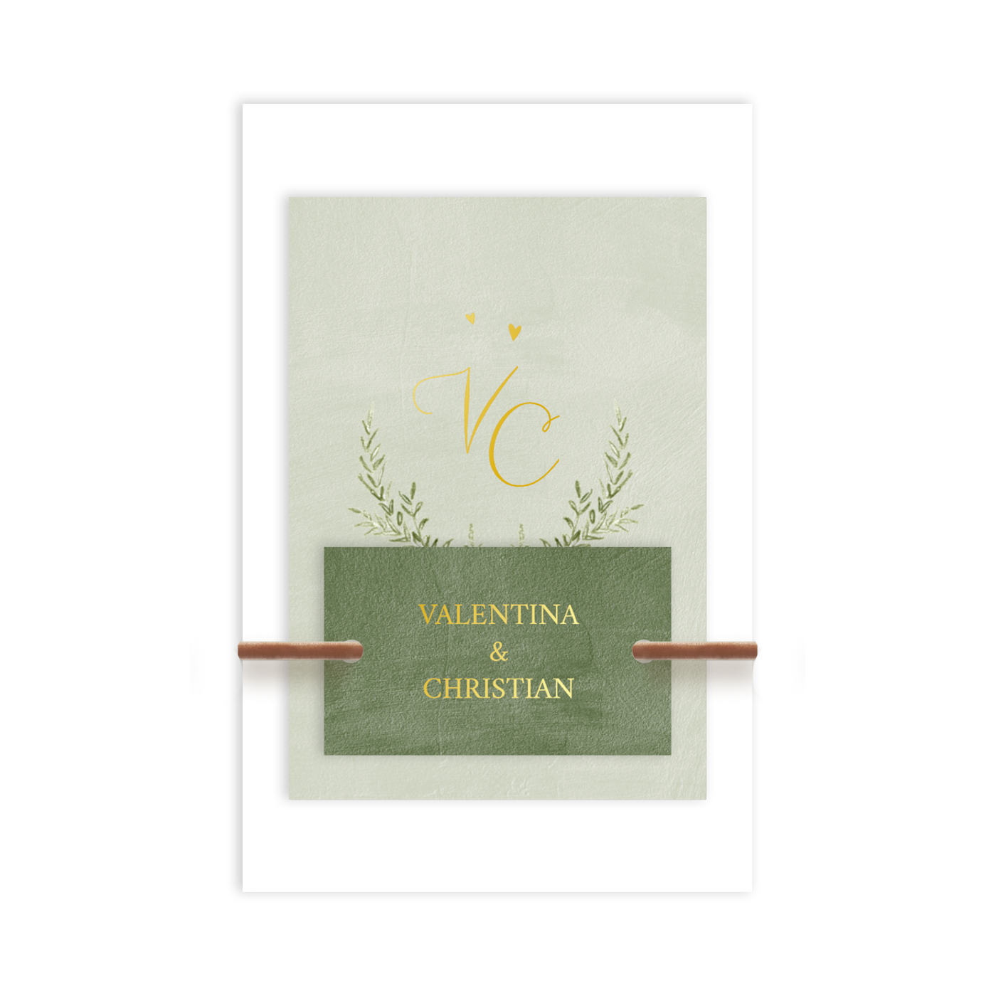 Originelle und minimalistische Hochzeitseinladung mit Vergoldungen und Olivenblättern.