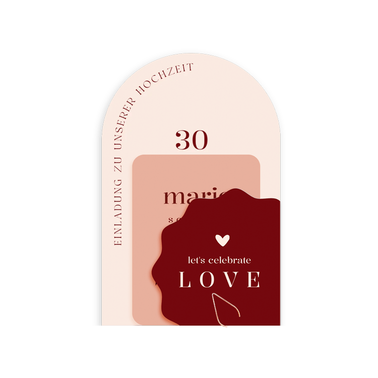 Eine wunderschöne Hochzeitkarte mit drei Kärtchen in einem trendigen Thema mit kirschroten Farben. Diese Hochzeitseinladung vereint Klassik und Moderne – perfekt für eine stilvolle Hochzeit. Bearbeiten Sie die Karte ganz einfach im Online-Editor.