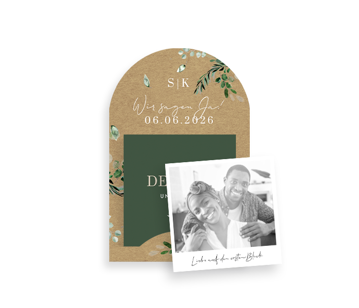 Hochzeitseinladung in gebogener Form mit Polaroidfoto. Dieses Design ist perfekt für Paare, die nach einer floralen und natürlichen Einladung suchen.