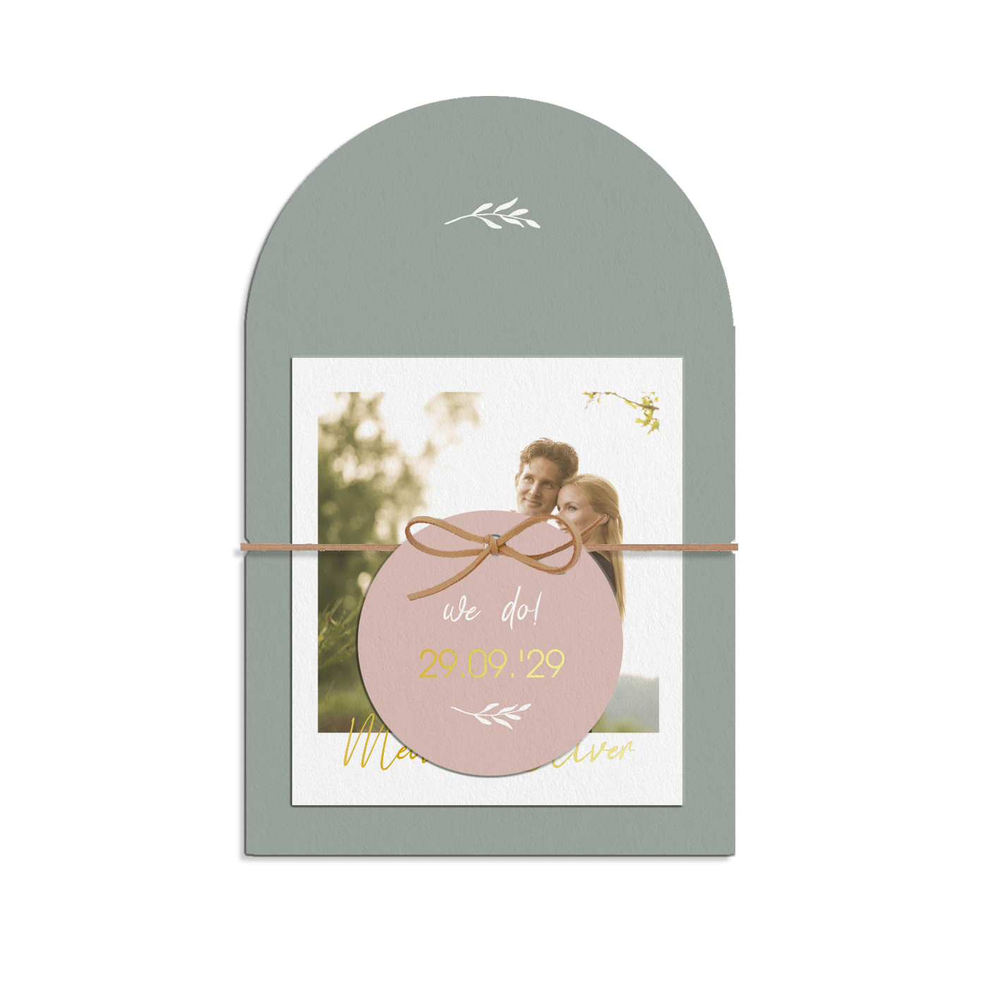 Hochzeitseinladung in Pastelltönen mit Foto und optionaler Schnur. Dieses Design ist perfekt für Paare, die nach einer außergewöhnlichen und eleganten Einladung suchen.