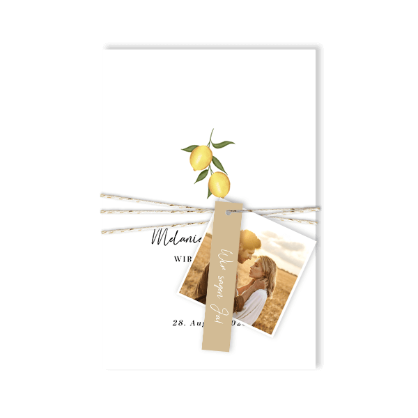 Schlichte Einladungskarte mit Zitronenzweig. Dieses Design ist perfekt für Paare, die nach einer sommerlichen und stilvollen Einladung suchen.