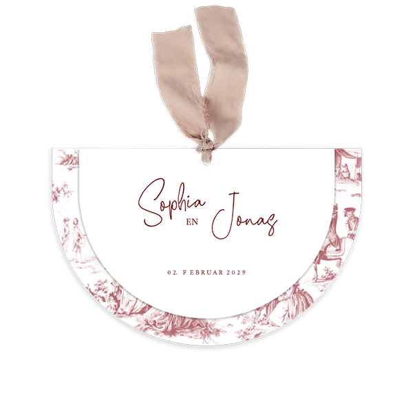 Abgerundete Einladungskarte mit rotem, historischen Hintergrund. Dieses Design ist perfekt für Paare, die nach einer außergewöhnlichen und stilvollen Einladung suchen.