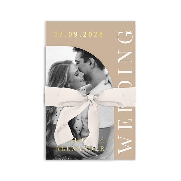 Hochzeitseinladung in Halbbogenform mit Goldfolie. Dieses Design ist perfekt für Paare, die nach einer modernen und stilvollen Einladung suchen.
