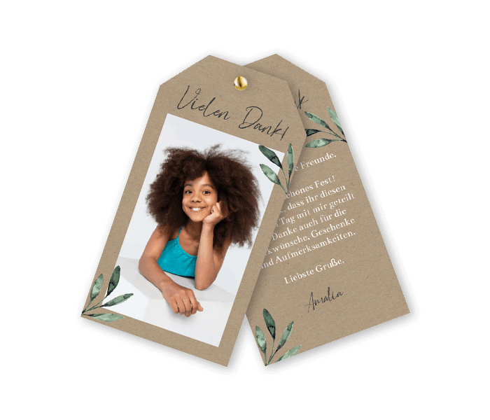 Die Label Dankeskarte mit Foto im Kraft-Look ist eine einfache und dennoch tolle Möglichkeit, um sich bei Freunden und Familie für ihre Teilnahme an eurer Kommunionzeremonie zu bedanken. Die Karte besteht aus zwei Teilen: einer Karte mit Platz für ein Foto und einer zweiten Karte für die Danksagung zur Kommunion.