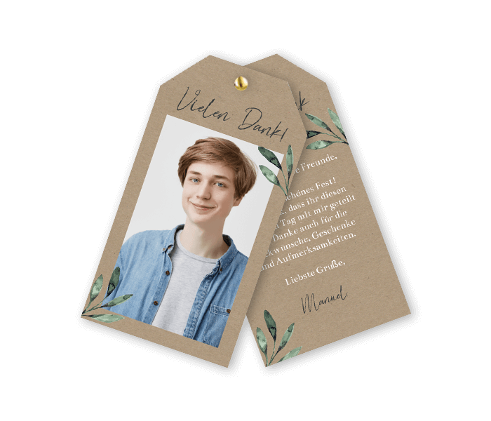 Dankeskarte zur Konfirmation im Kraft-Look mit Eukalyptus und Foto