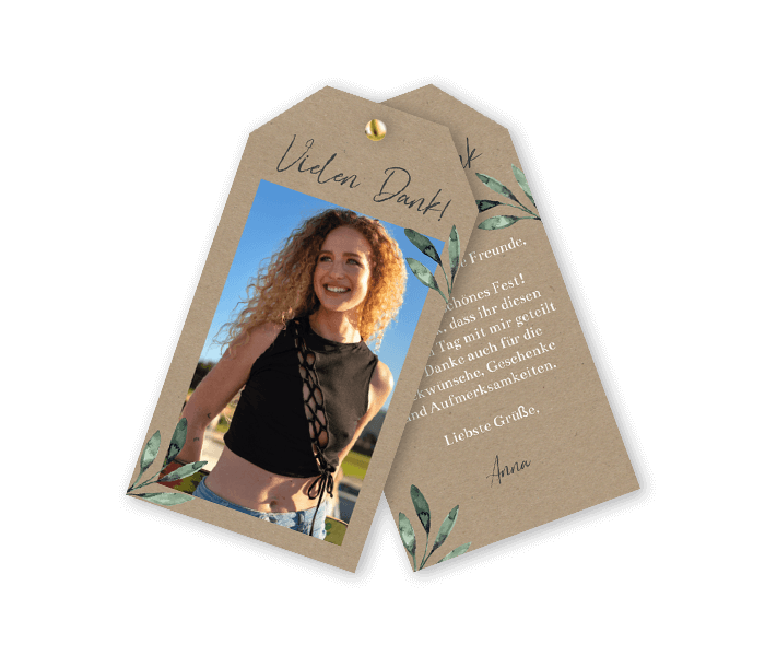Die Label Dankeskarte mit Foto im Kraft-Look ist eine einfache und dennoch tolle Möglichkeit, um sich bei Freunden und Familie für ihre Teilnahme an eurer Firmungzeremonie zu bedanken. Die Karte besteht aus zwei Teilen: einer Karte mit Platz für ein Foto und einer zweiten Karte für die Danksagung zur Firmung.