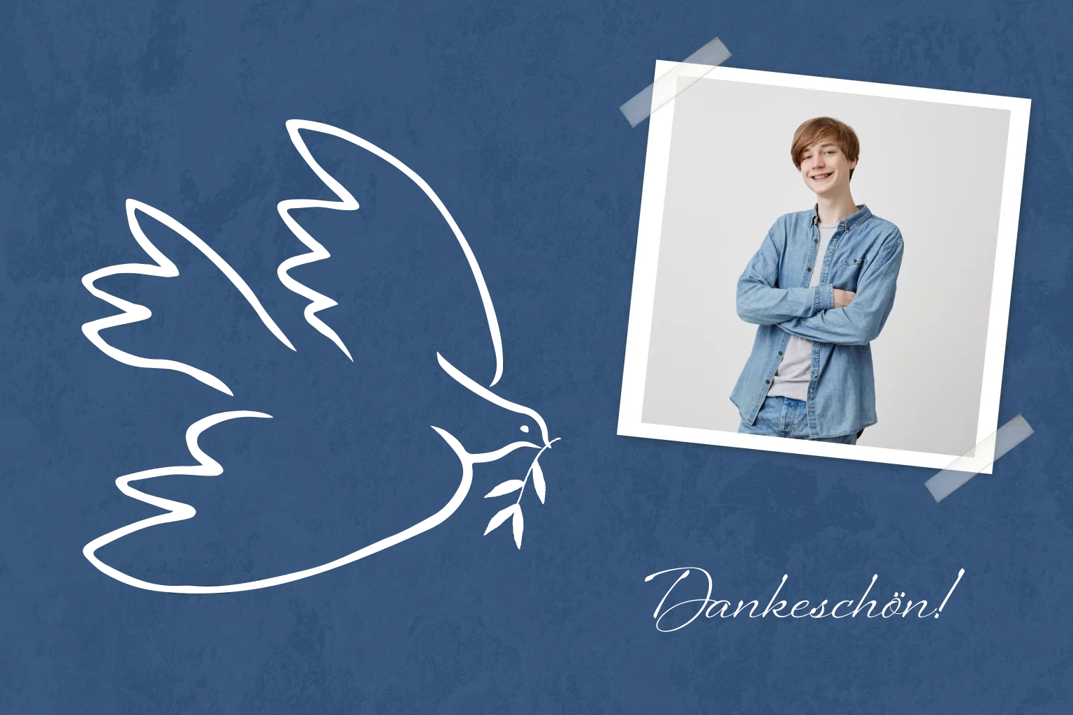Dankeskarte zur Firmung in Blau mit Foto und Taube in Goldfolie
