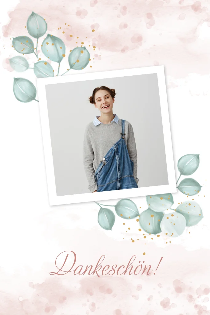 Dankeskarte zur Firmung mit Eukalyptus und FotoDas Design der von dir gewählten Karte wurde automatisch in andere Formate umgestellt. Wähle einfach deinen Wunschformat aus und platziere alle Texte und Elemente an der richtigen Stelle im Editor. Du hast Fragen oder dein Favorit steht nicht zur Auswahl? Dann kontaktiere uns bitte und wir werden uns gemeinsam darum kümmern!