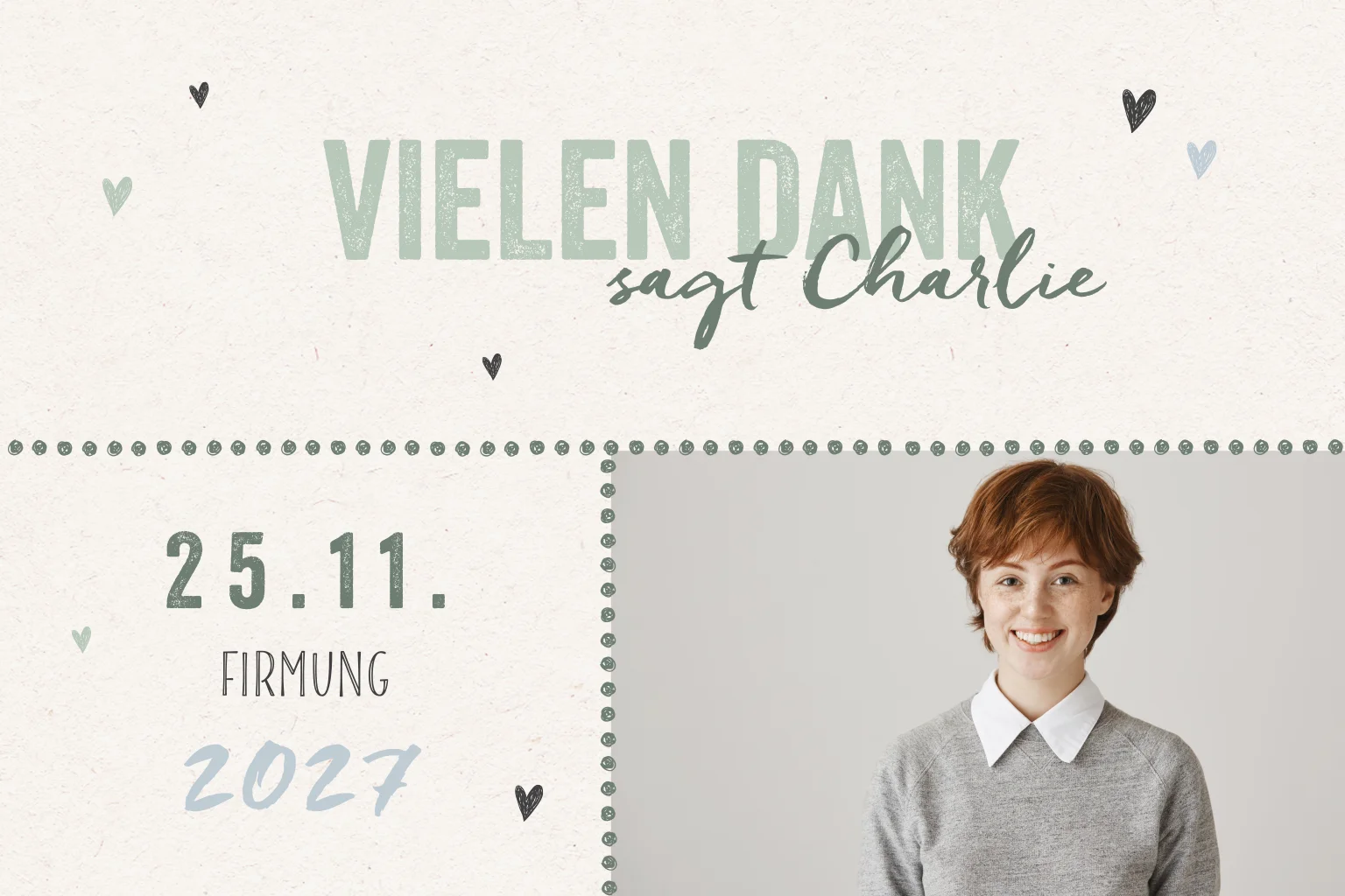 Dankeskarte zur Firmung mit salbeigrüner Schrift und FotoDas Design der von dir gewählten Karte wurde automatisch in andere Formate umgestellt. Wähle einfach deinen Wunschformat aus und platziere alle Texte und Elemente an der richtigen Stelle im Editor. Du hast Fragen oder dein Favorit steht nicht zur Auswahl? Dann kontaktiere uns bitte und wir werden uns gemeinsam darum kümmern!