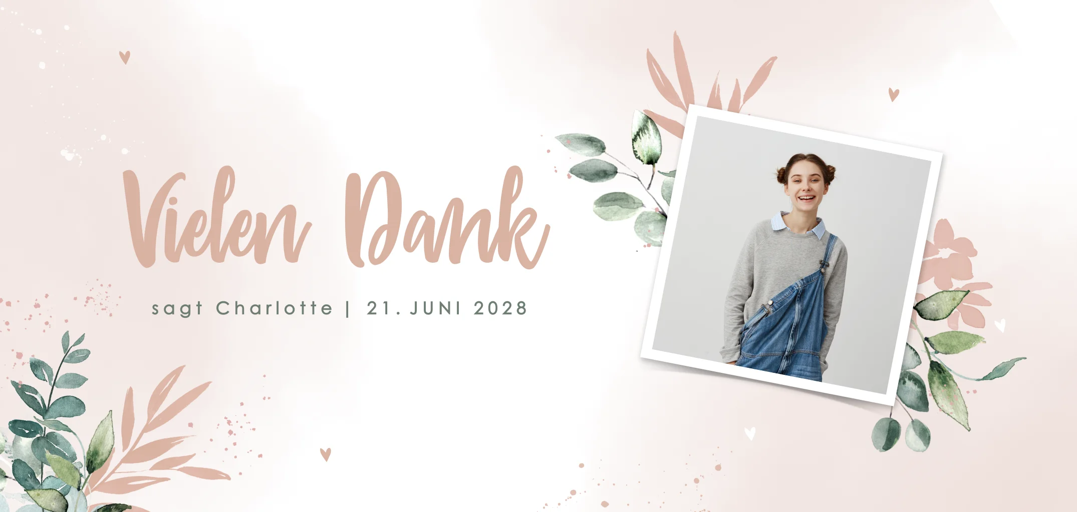 Dankeskarte Firmung mit Zweigen und Foto auf der VorderseiteMelde dich für unseren Newsletter an und profitiere von exklusiven Angeboten, kreativen Ideen und Neuigkeiten aus unserer Produktwelt. Als Dankeschön für deine Anmeldung schenken wir dir einen kostenlosen Probedruck deiner Karte.
