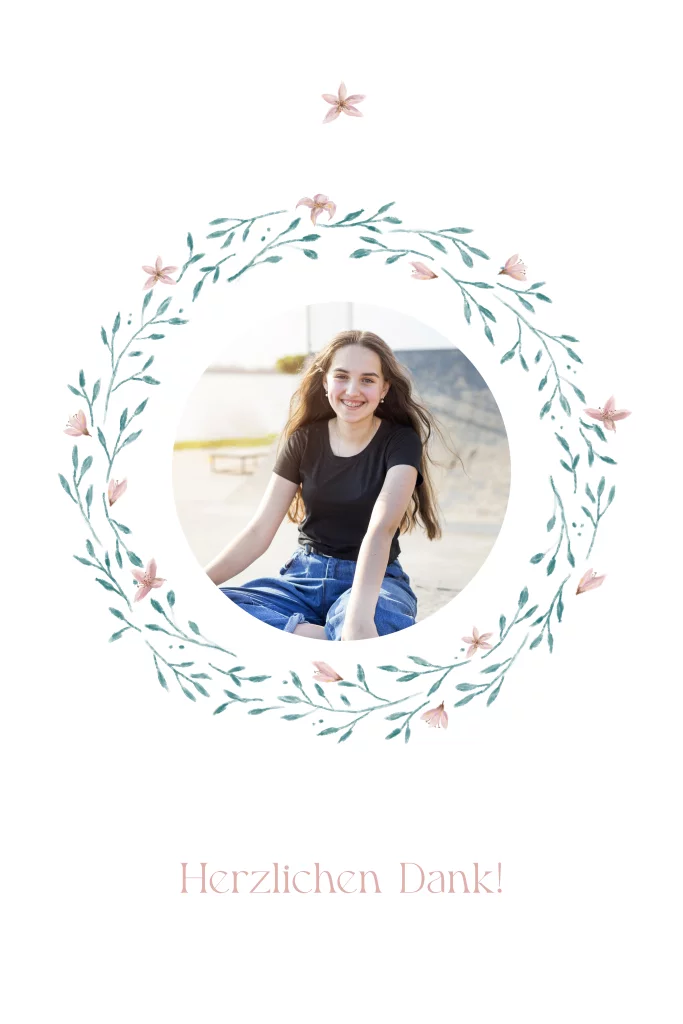 Dankeskarte zur Jugendweihe mit Aquarellblumen und FotoMelde dich für unseren Newsletter an und profitiere von exklusiven Angeboten, kreativen Ideen und Neuigkeiten aus unserer Produktwelt. Als Dankeschön für deine Anmeldung schenken wir dir einen kostenlosen Probedruck deiner Karte.
