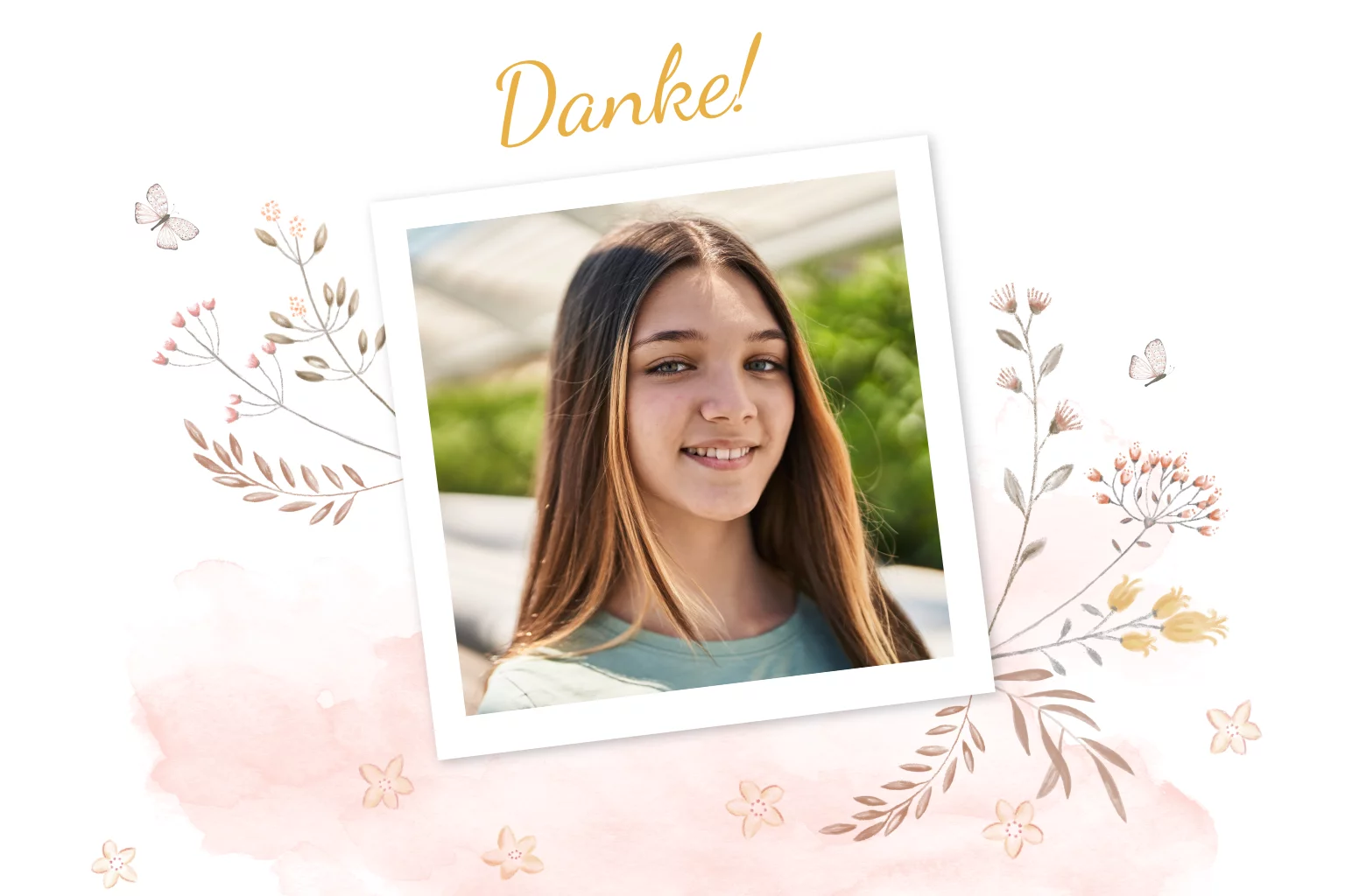 Dankeskarte Jugendweihe mit Foto, gemalten Blumen und SchmetterlingenMelde dich für unseren Newsletter an und profitiere von exklusiven Angeboten, kreativen Ideen und Neuigkeiten aus unserer Produktwelt. Als Dankeschön für deine Anmeldung schenken wir dir einen kostenlosen Probedruck deiner Karte.