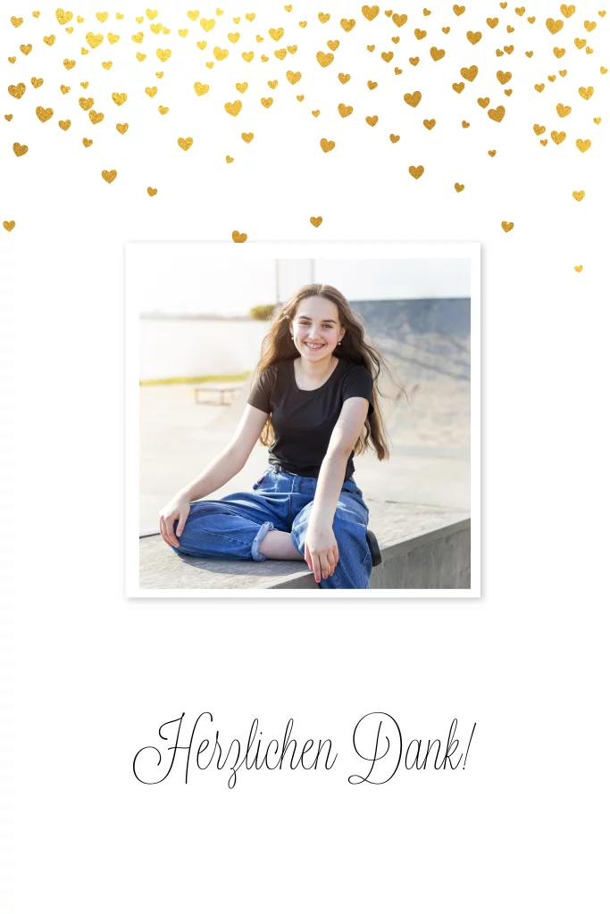 Dankeskarte Jugendweihe mit Foto und goldenem Konfetti mit Herzen