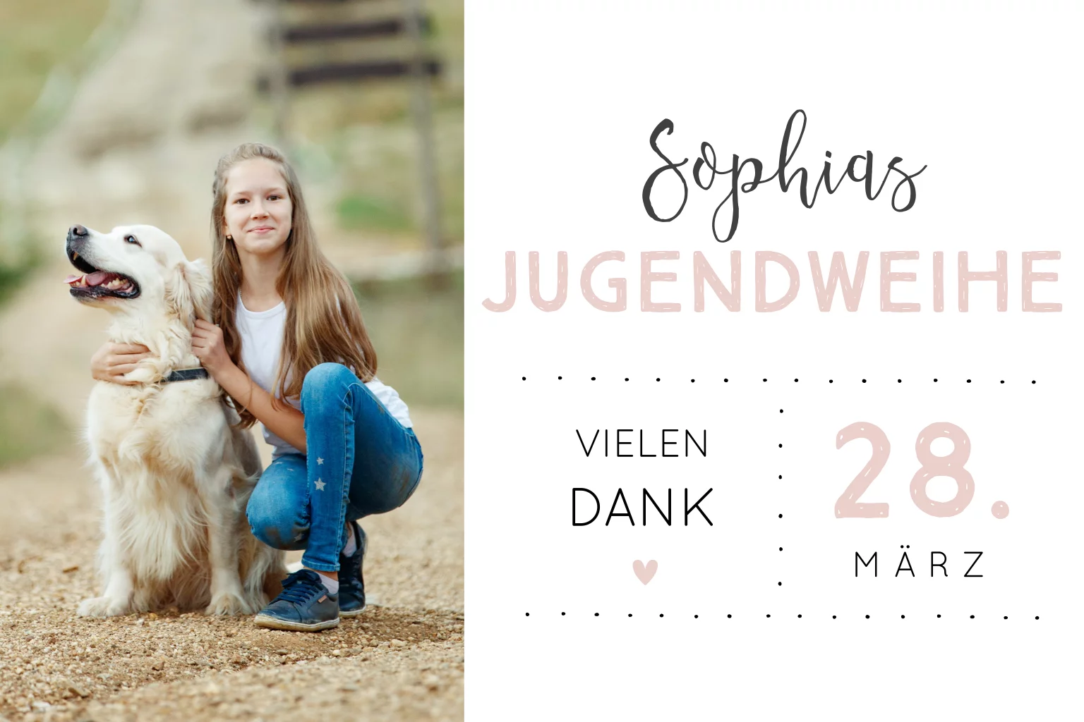 Dankeskarte Jugendweihe mit Foto und rosa SchriftAuf der Suche nach mehr Inspiration? Sieh dir hier unsere Dankeskarten zur Jugendweihe an.