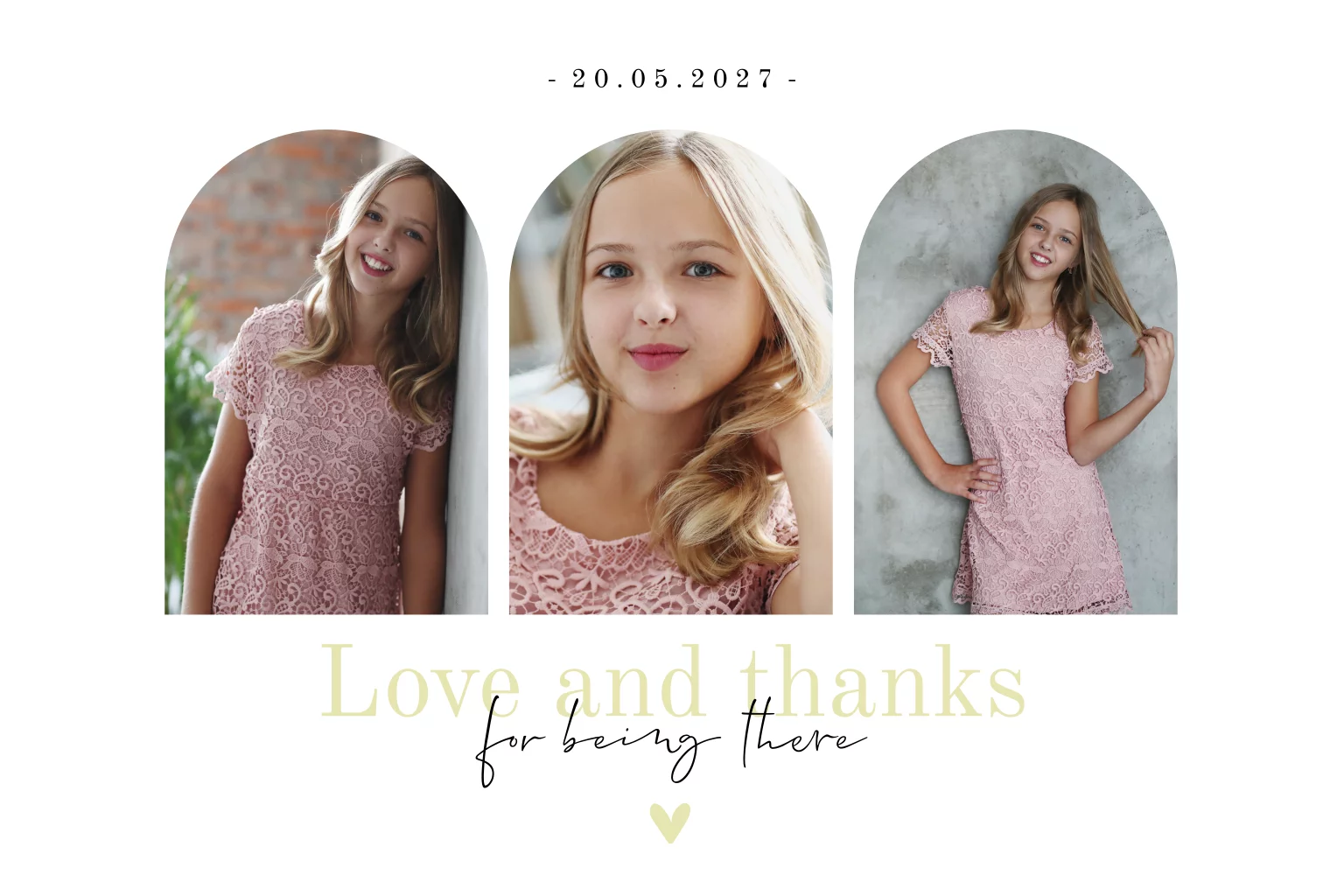 Dankeskarte Jugendweihe mit Fotos in Bogenform und Aquarell BlätternMelde dich für unseren Newsletter an und profitiere von exklusiven Angeboten, kreativen Ideen und Neuigkeiten aus unserer Produktwelt. Als Dankeschön für deine Anmeldung schenken wir dir einen kostenlosen Probedruck deiner Karte.