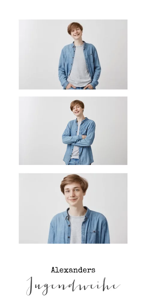 Dankeskarte zur Jugendweihe im Polaroid-Look mit drei FotosAuf der Suche nach mehr Inspiration? Sieh dir hier unsere Danksagungen zur Jugendweihe an.
