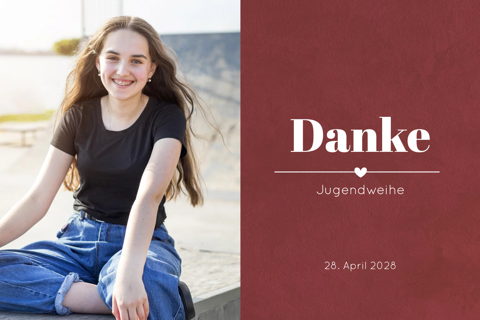 Dankeskarte zur Jugendweihe mit Roségoldfolie und großem FotoMelde dich für unseren Newsletter an und profitiere von exklusiven Angeboten, kreativen Ideen und Neuigkeiten aus unserer Produktwelt. Als Dankeschön für deine Anmeldung schenken wir dir einen kostenlosen Probedruck deiner Karte.