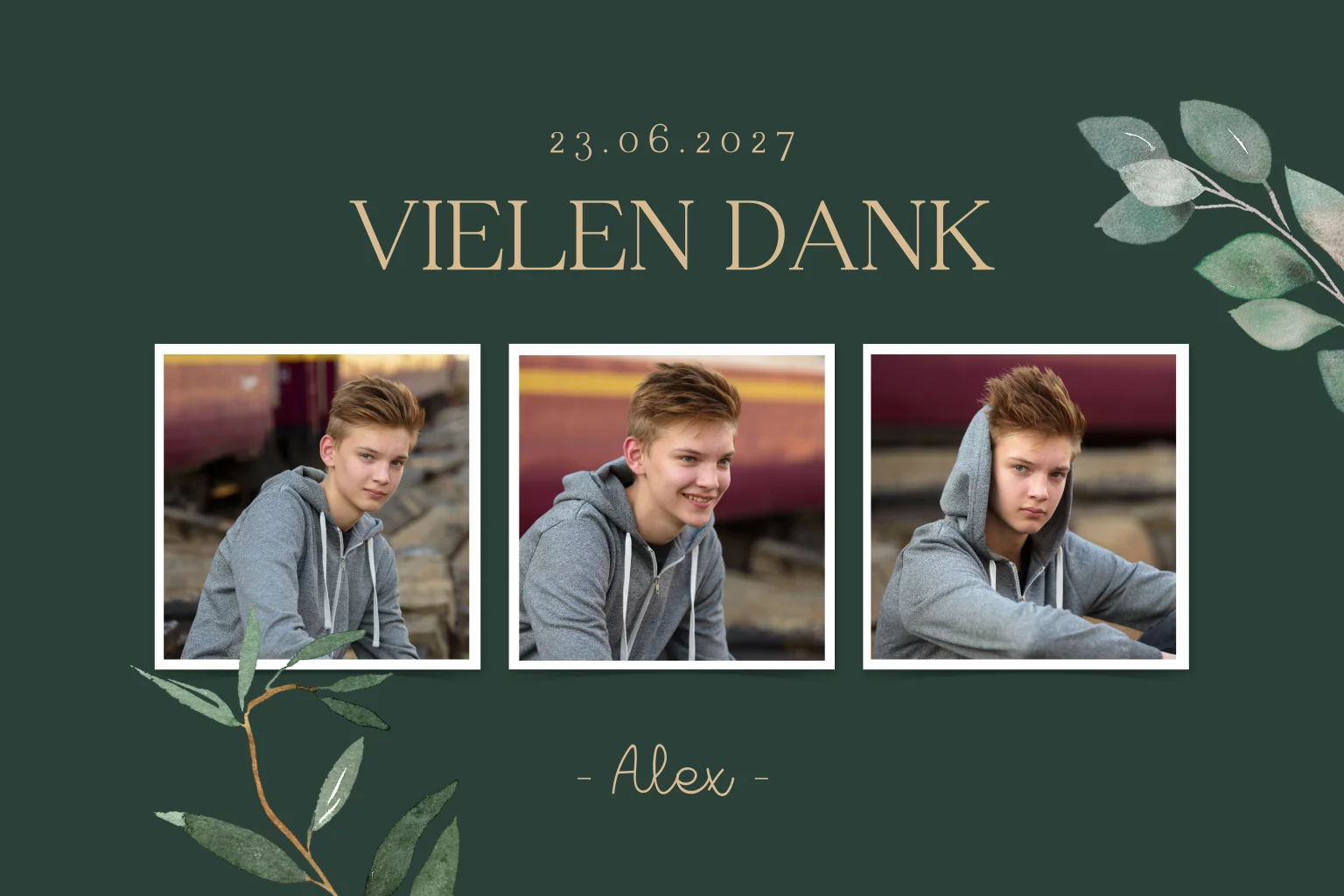 Dankeskarte Jungendweihe mit 3 Fotos und Zweigen