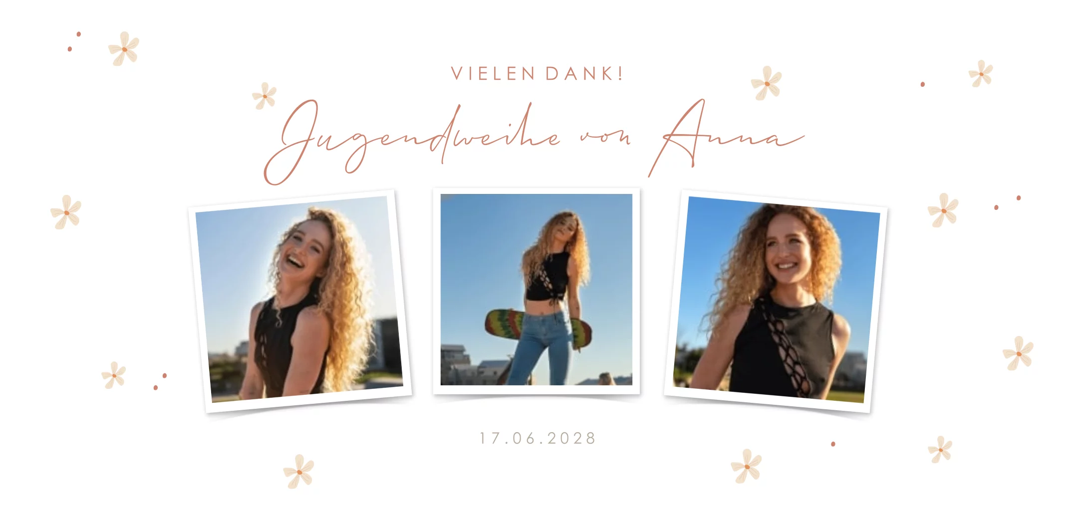 Hübsche Dankeskarte zur Jugendweihe mit 3 Fotos und Blümchen im Hintergrund.Melde dich für unseren Newsletter an und profitiere von exklusiven Angeboten, kreativen Ideen und Neuigkeiten aus unserer Produktwelt. Als Dankeschön für deine Anmeldung schenken wir dir einen kostenlosen Probedruck deiner Karte.