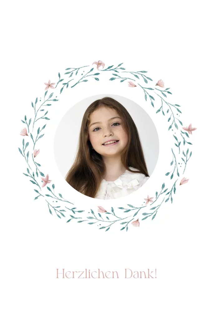 Dankeskarte zur Kommunion mit Aquarellblumen und Foto