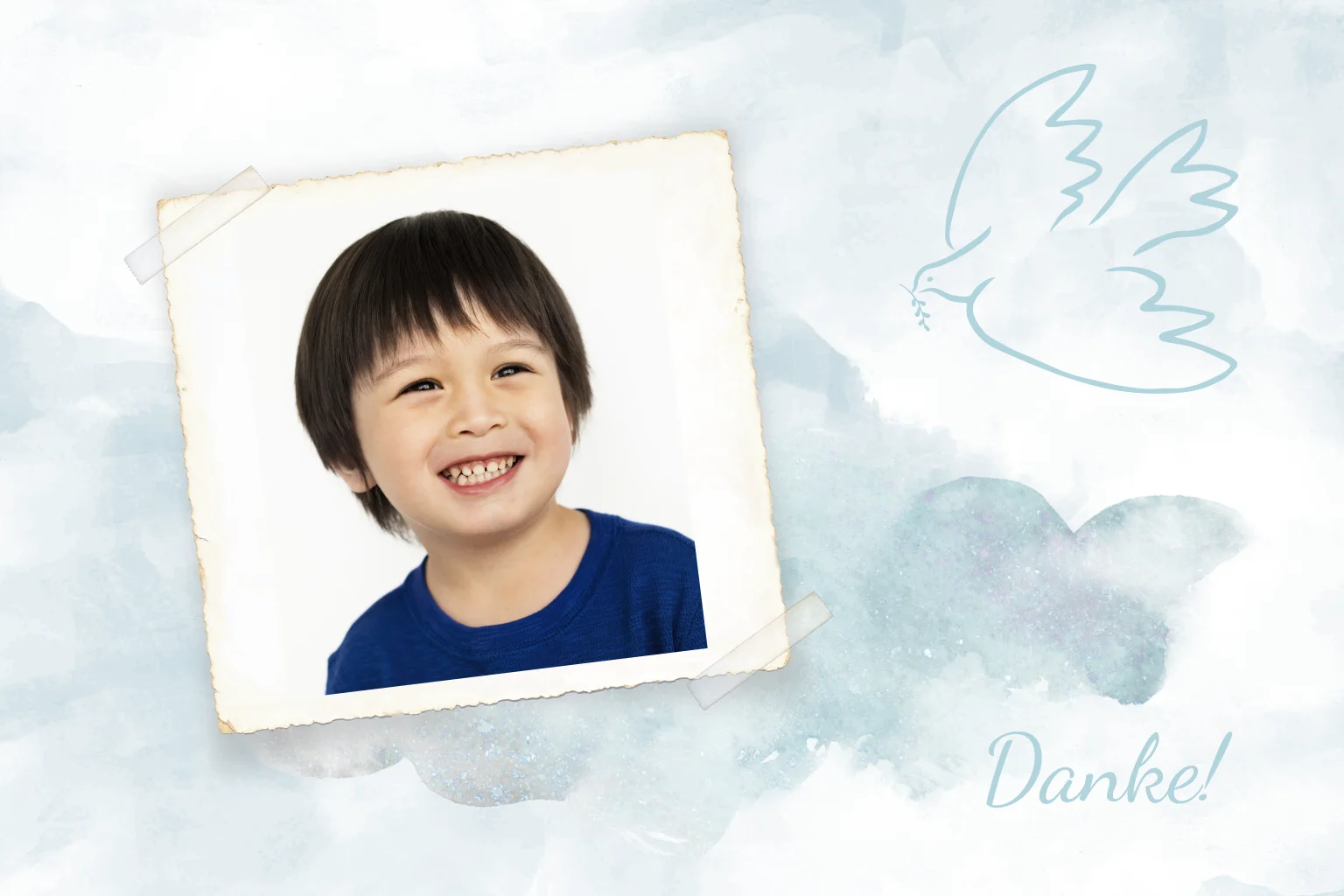 Eine ruhige Dankeskarte mit Foto und einer Taube und blauem Aquarell im Hintergrund.
