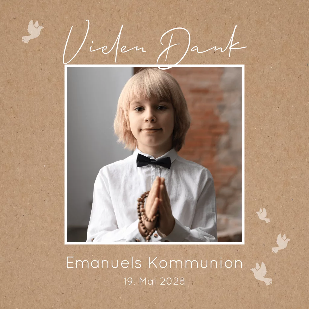 Danksagung zur Kommunion im Kraft-Look mit Foto und Tauben