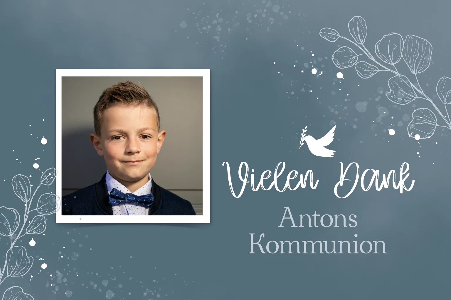 Danksagungskarte zur Kommunion in Blau mit weißen Blättern, Goldspritzern und Foto