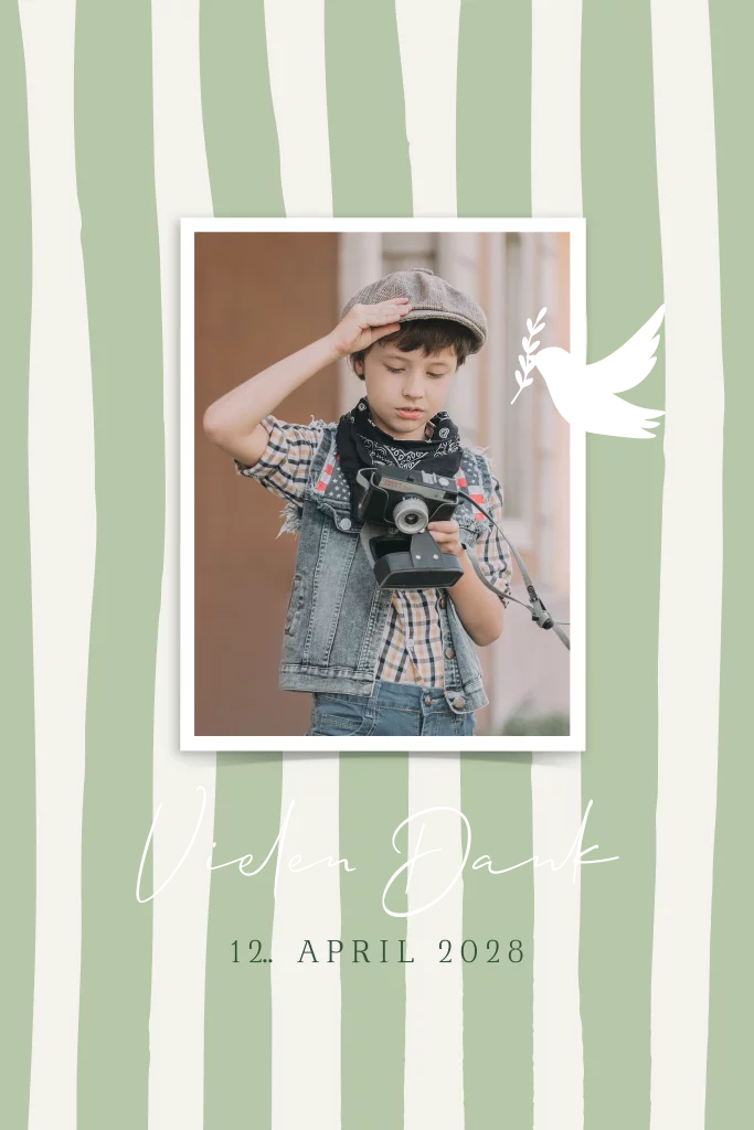 Danksagungskarte zur Kommunion mit Foto, Taube, grünen Streifen und Goldfolie
