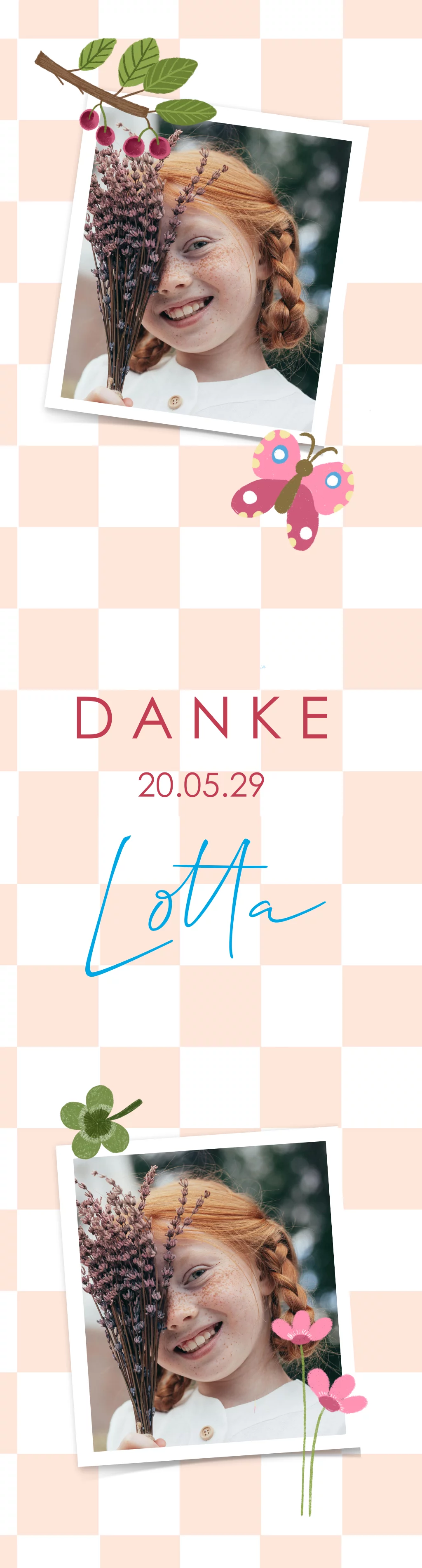 Fröhliches Lesezeichen als Fotostreifen Dankeskarte zur Kommunion 4 Stück Dieses 4er-Set besteht aus vier Karten, die du selbst bearbeiten kannst. Wenn du also zum Beispiel fünf 4er-Sets bestellst, erhältst du 20 Karten.