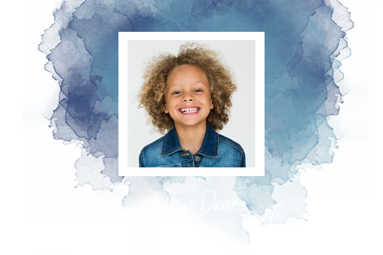 Eine Dankeskarte in Blautönen mit einem Foto und Aquarell-Look auf dem Hintergrund.Melde dich für unseren Newsletter an und profitiere von exklusiven Angeboten, kreativen Ideen und Neuigkeiten aus unserer Produktwelt. Als Dankeschön für deine Anmeldung schenken wir dir einen kostenlosen Probedruck deiner Karte.