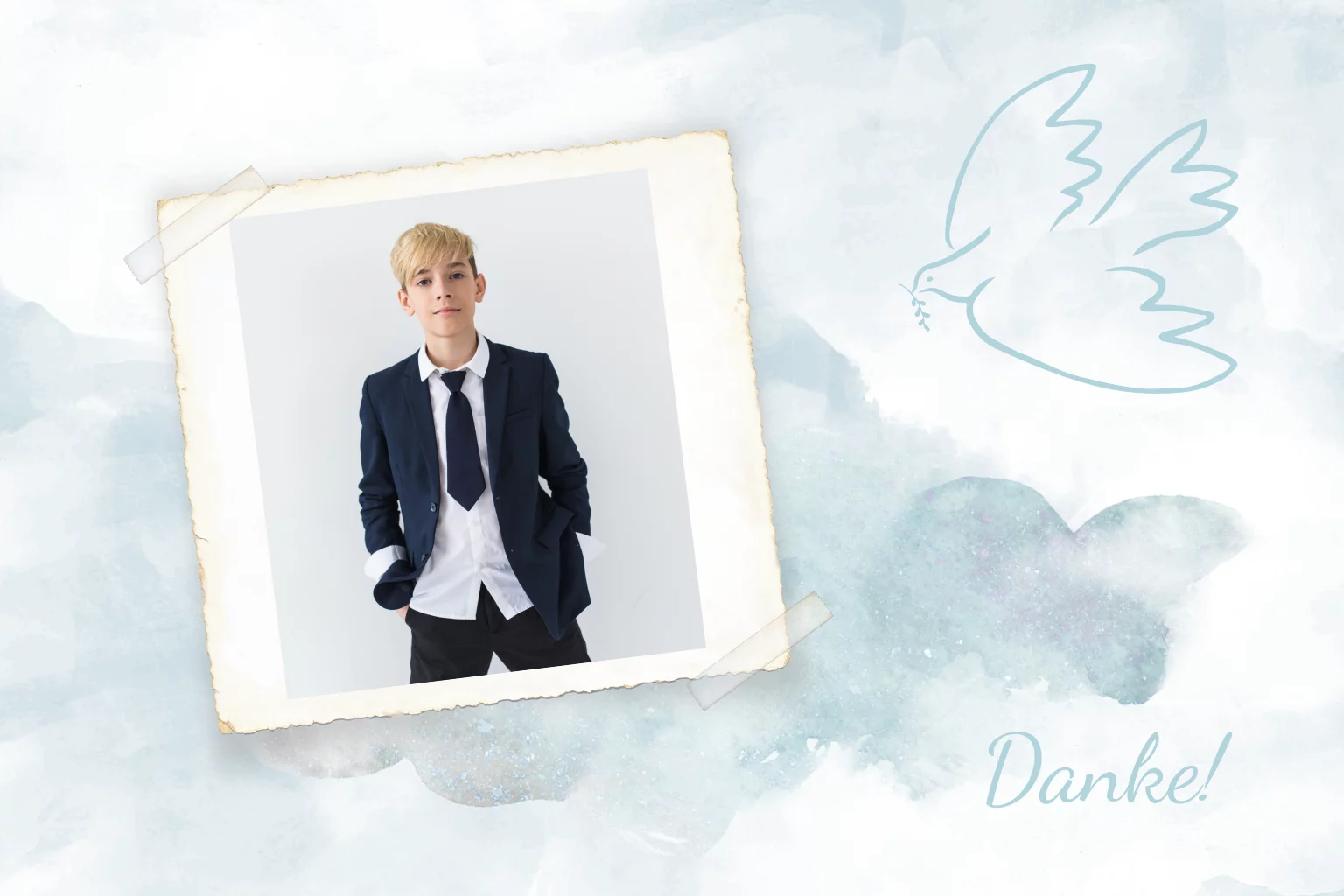 Dankeskarte Konfirmation mit Foto, Taube und blaue Wasserfarbe