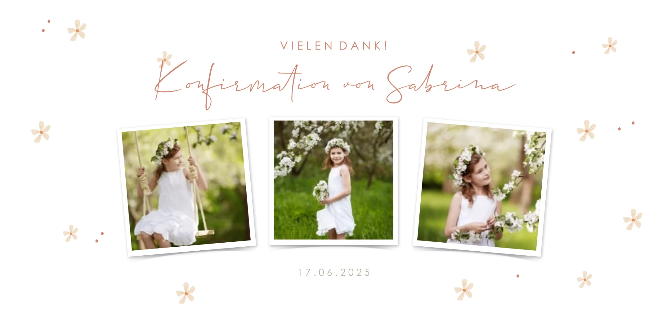Hübsche Dankeskarte zur Konfirmation mit 3 Fotos und Blümchen im Hintergrund.Auf der Suche nach mehr Inspiration? Sieh dir hier unsere Dankeskarte zur Konfirmation an.