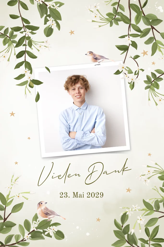 Danksagung zur Konfirmation mit Foto, Vögeln und Zweigen