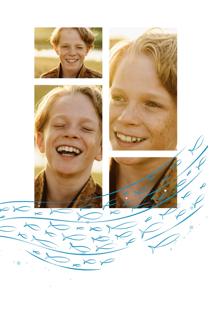 Danksagung zur Konfirmation mit Fotos und gezeichneten Fischschwarm