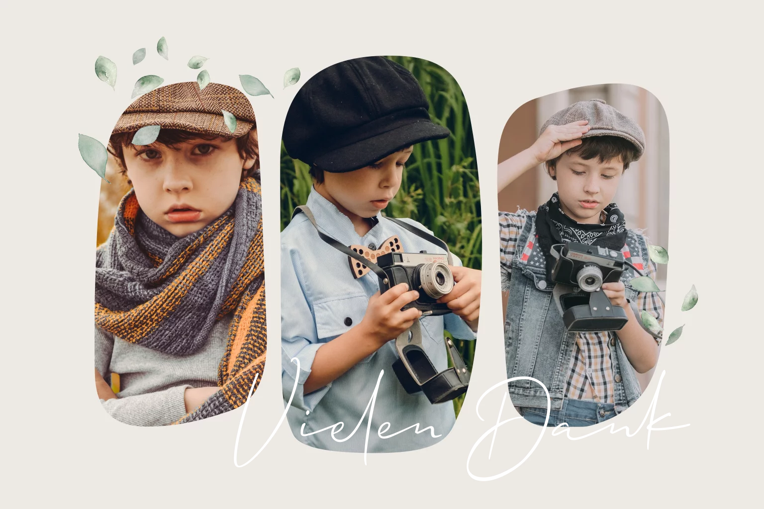 Danksagungskarte zur Kommunion mit 3 Fotos, Goldfolie und Blättern