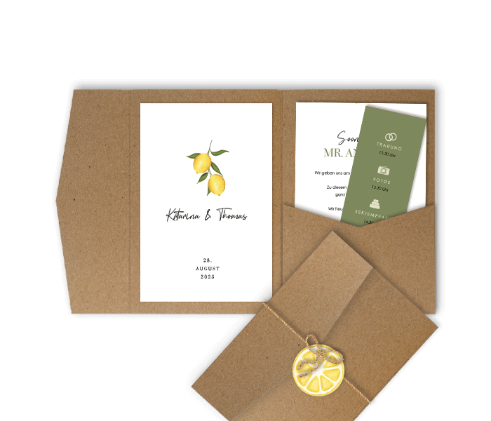 Sieh dir hier all unsere Hochzeitseinladungen mit Zitronen an.