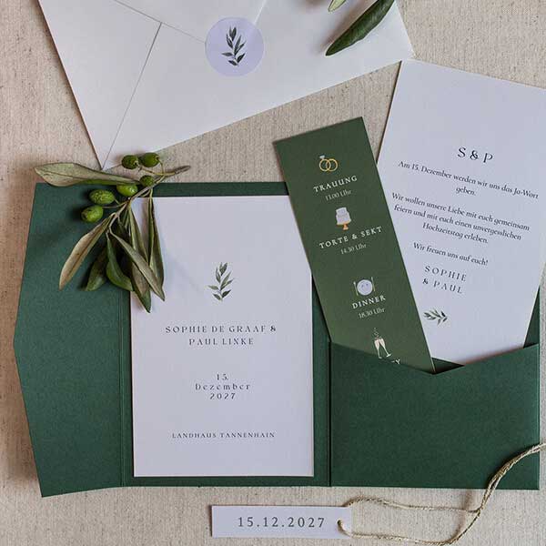 Sieh dir hier all unsere Hochzeitseinladungen mit Olivenzweigen an.