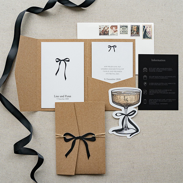 Pocketfold Hochzeitseinladung mit Schleifen und Champagnerglas