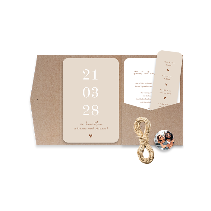 Stilvolle Pocketfold Hochzeitseinladung in Beige mit Herzen und Foto.