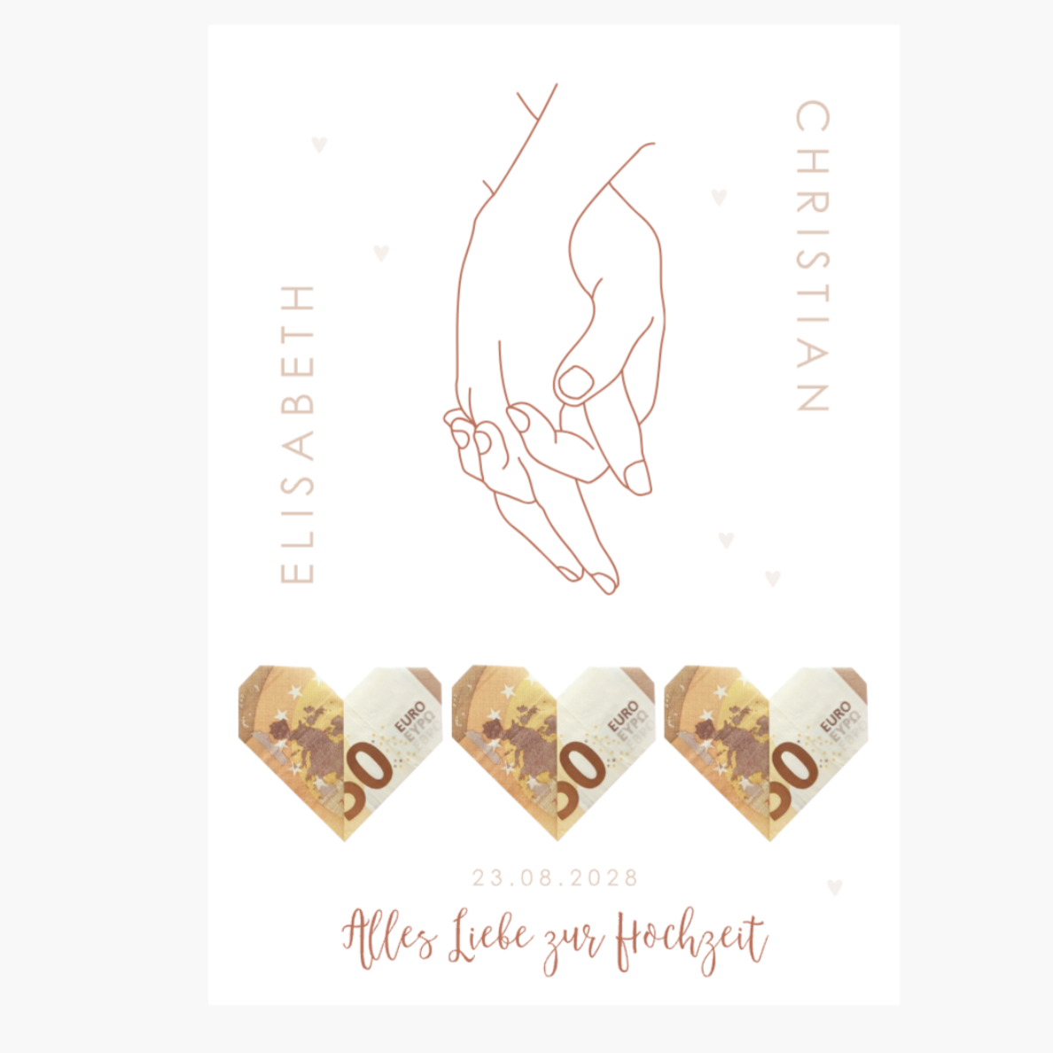 Verwende leicht haftendes Klebeband, um das Geld zu befestigen, damit das Poster nach der Hochzeit noch vom Brautpaar verwendet werden kann. Wir haben die Poster so gestaltet, dass sie als Erinnerungsstück nach der Hochzeit dienen können. Oder rahme das Poster in einem Bilderrahmen ein.