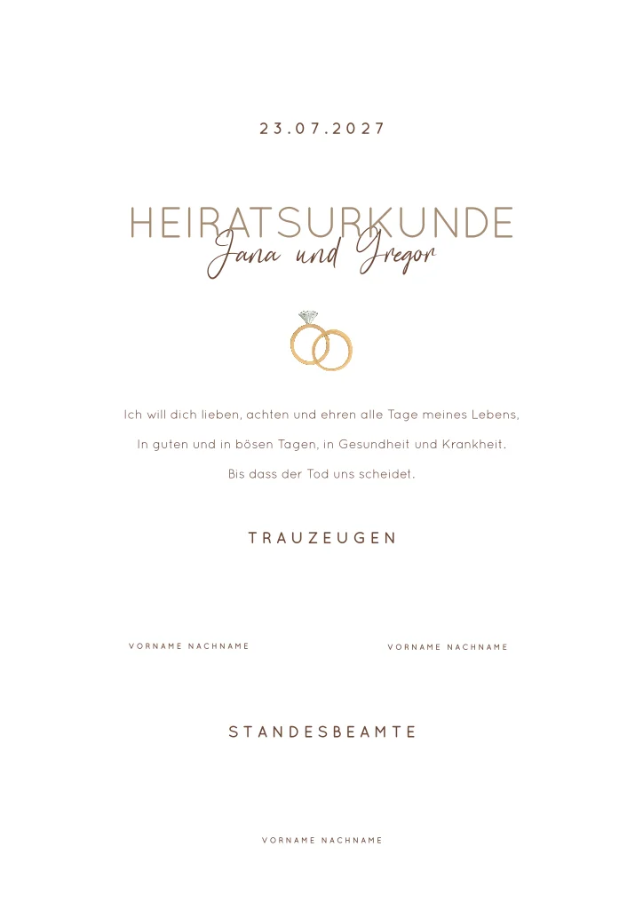 Unterschreibt an eurem Hochzeitstag auch diese inoffizielle Urkunde als Erinnerung: ein A4-Poster, das ihr später in eurem Haus aufhängen könnt. Wir empfehlen, zur Sicherheit, zwei zu bestellen.