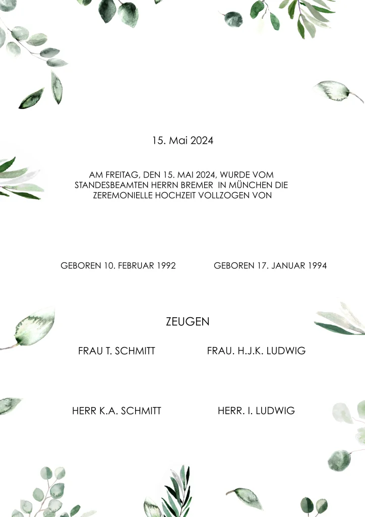 Unterschreibt an eurem Hochzeitstag auch diese inoffizielle Urkunde als Erinnerung: ein A4-Poster, das ihr später in eurem Haus aufhängen könnt. Wir empfehlen, zur Sicherheit, zwei zu bestellen.