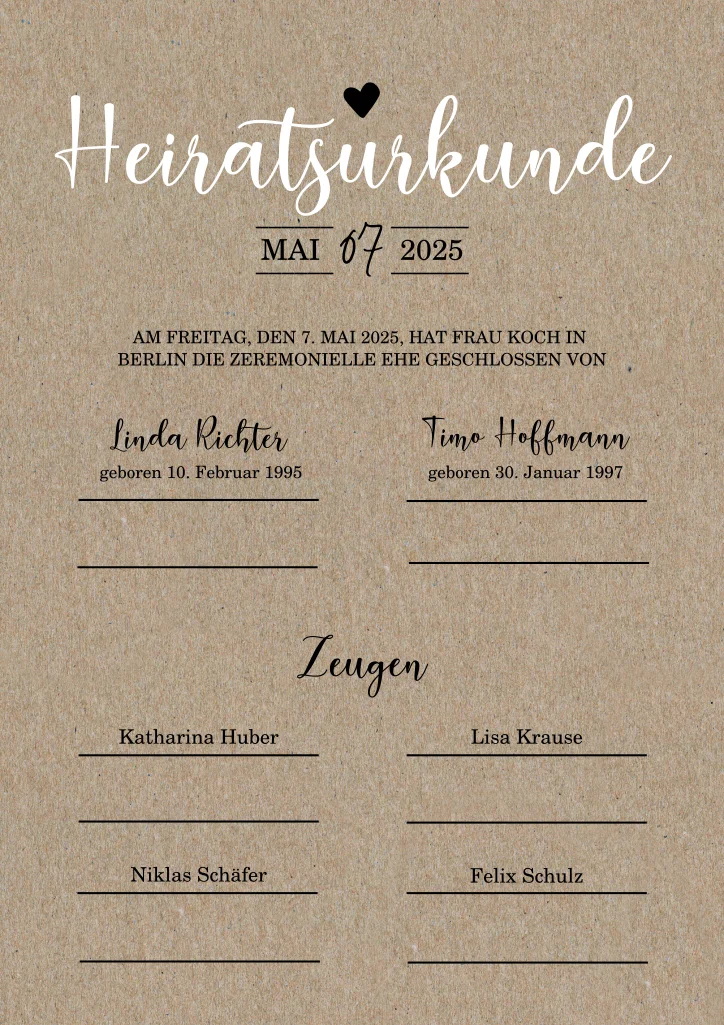 Unterschreibt an eurem Hochzeitstag auch diese inoffizielle Urkunde als Erinnerung: ein A4-Poster, das ihr später in eurem Haus aufhängen könnt. Wir empfehlen, zur Sicherheit, zwei zu bestellen.