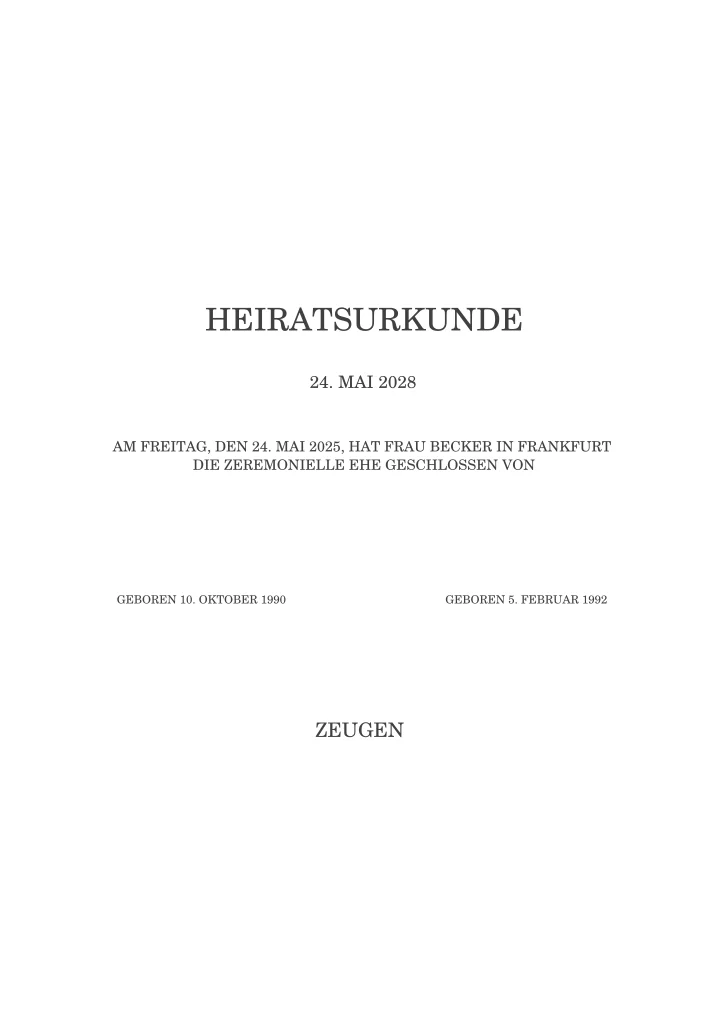 Unterschreibt an eurem Hochzeitstag auch diese inoffizielle Urkunde als Erinnerung: ein A4-Poster, das ihr später in eurem Haus aufhängen könnt. Wir empfehlen, zur Sicherheit, zwei zu bestellen.