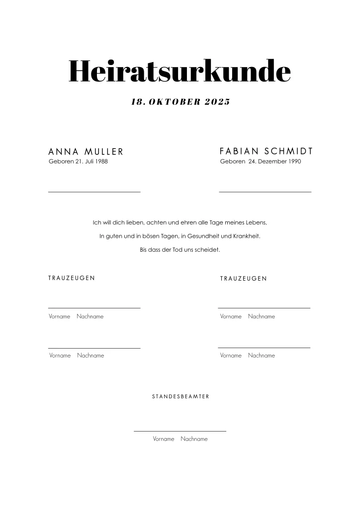Unterschreibt an eurem Hochzeitstag auch diese inoffizielle Urkunde als Erinnerung: ein A4-Poster, das ihr später in eurem Haus aufhängen könnt. Wir empfehlen, zur Sicherheit, zwei zu bestellen.